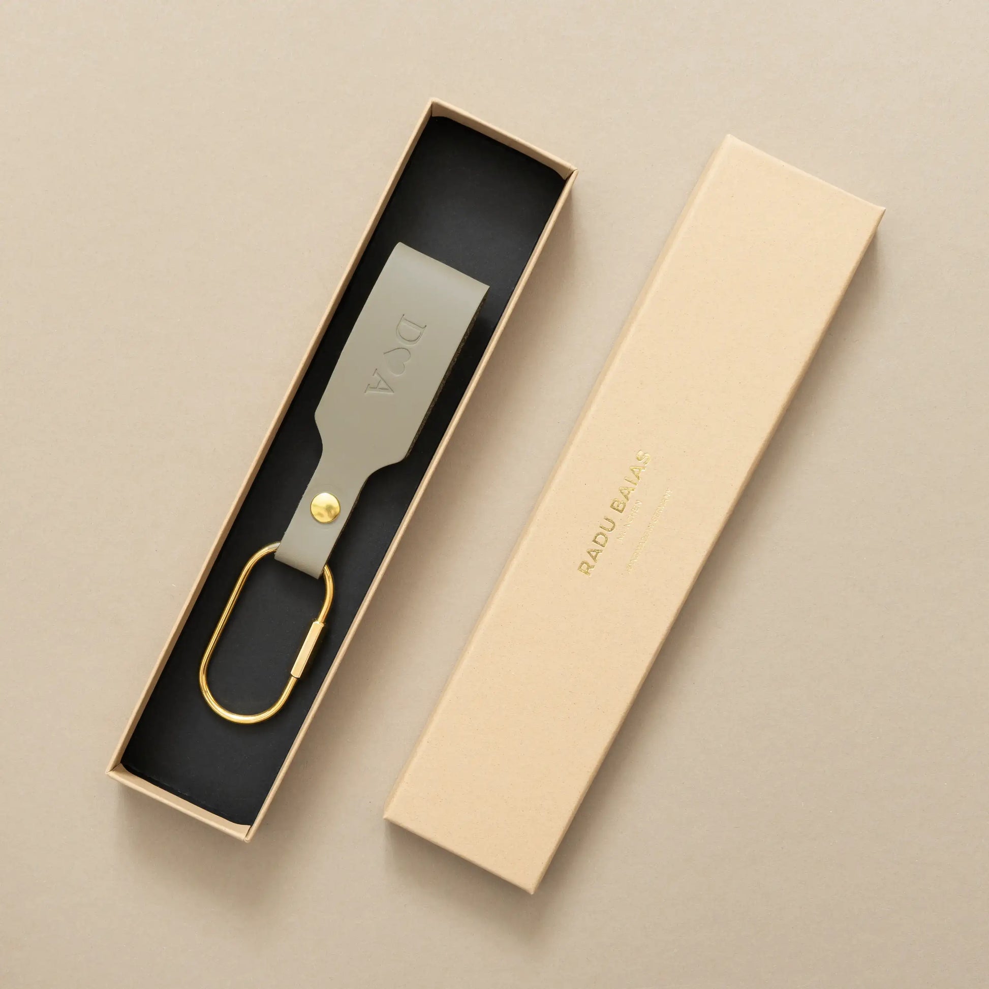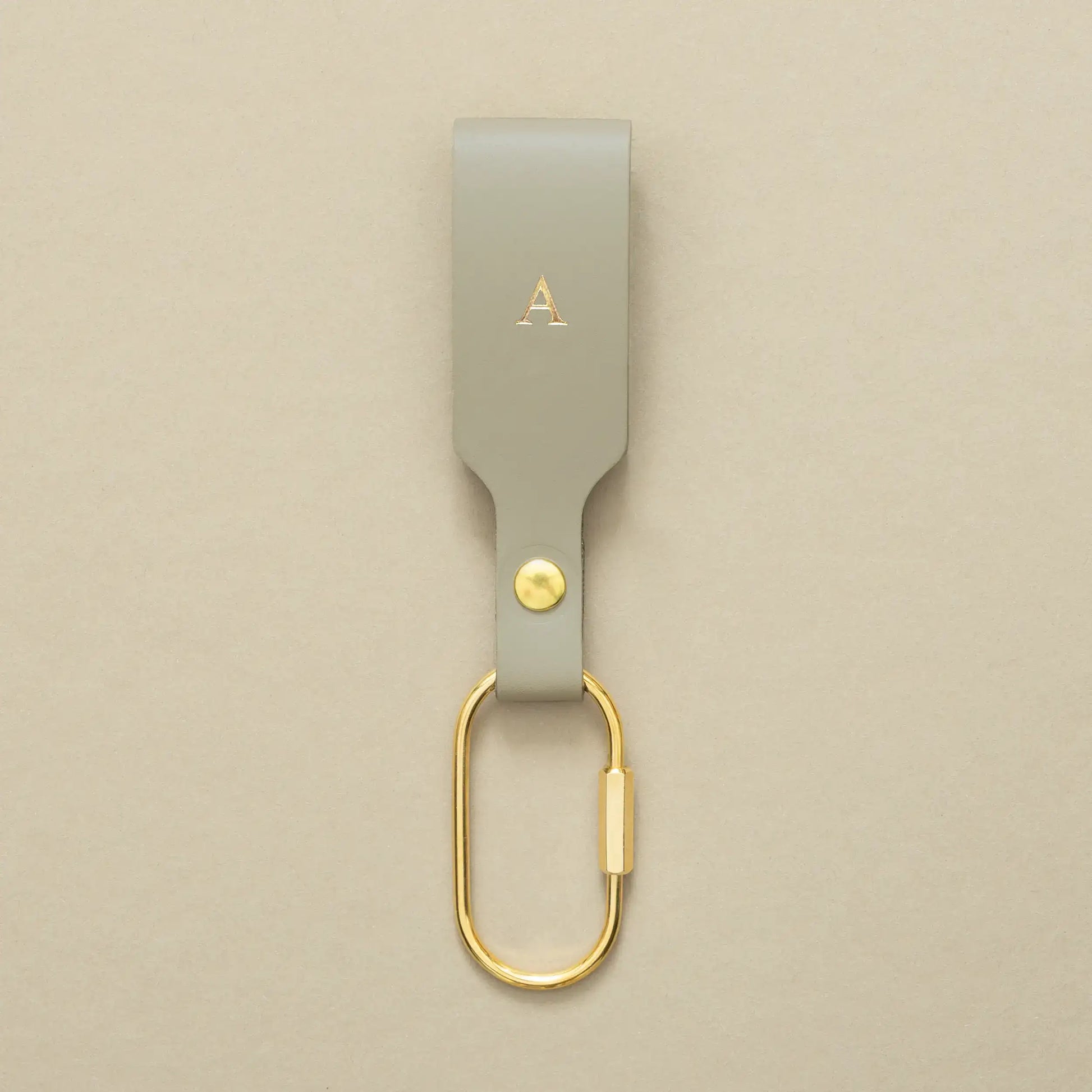Porte-clés gris mousse avec mousqueton doré – en cuir de qualité supérieure
