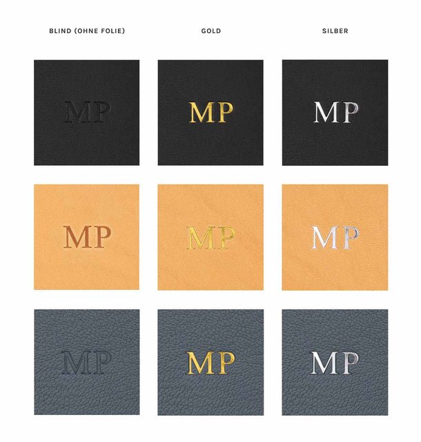 Für alle unsere Schlüsselanhänger und Portemonnaies bieten wir eine Personalisierung in Form einer hochwertigen Prägung an. Eine Prägung ist in drei verschiedenen Varianten möglich: gold, silber oder als Blindprägung ohne Folie.
